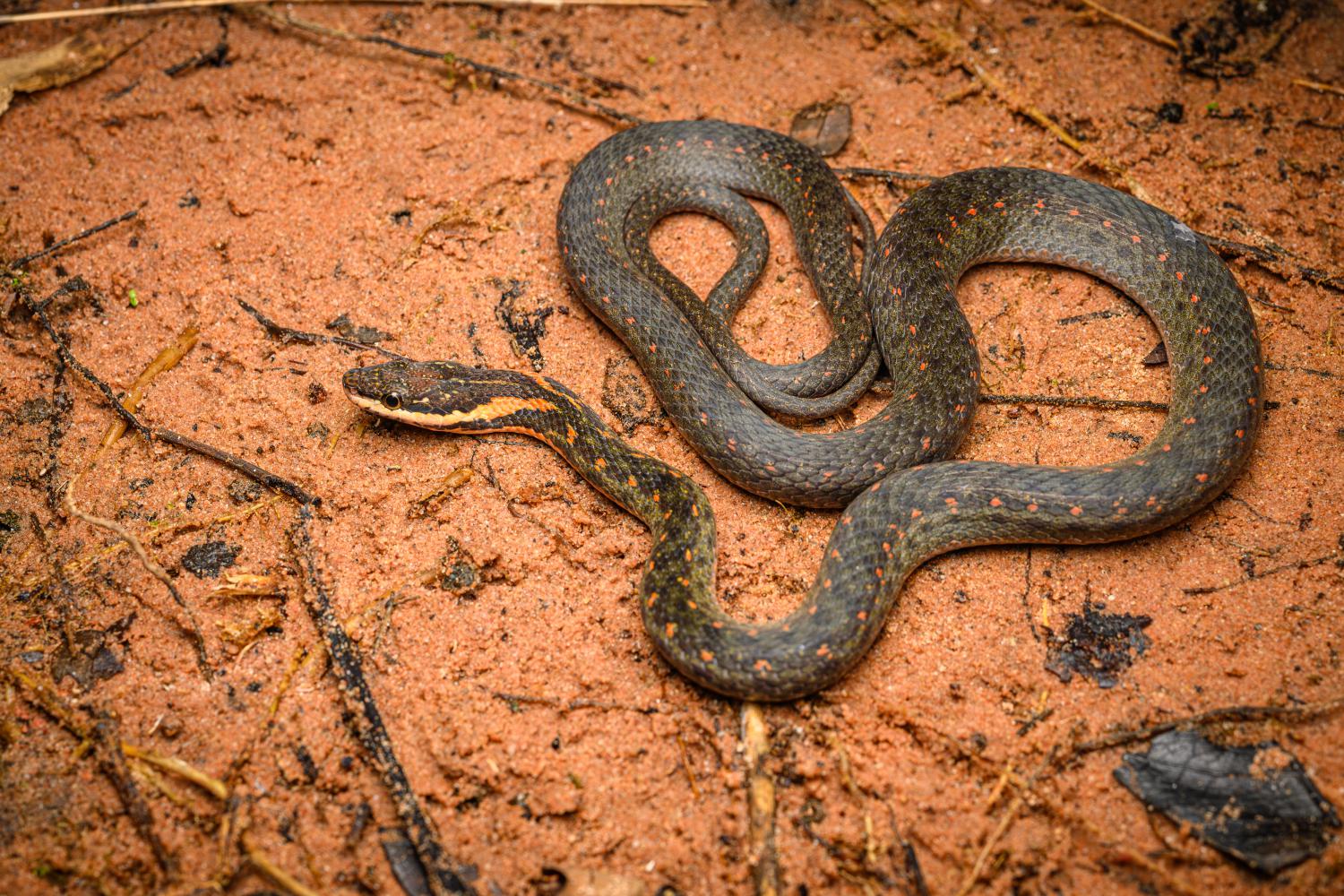 They grow to 406 mm in snout–vent length and 595 mm in total length. It has a beautiful yellow-white stripe that sweeps along its head, and red dots cover its body.